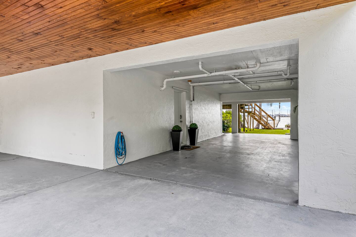 The carport is your designated parking spot. You have a private terrace with out door seating. The home upstairs sometimes has other guests and they have their own private terrace upstairs. Please not that the dock however is a shared space.