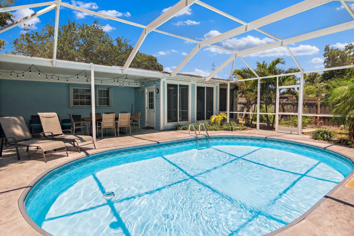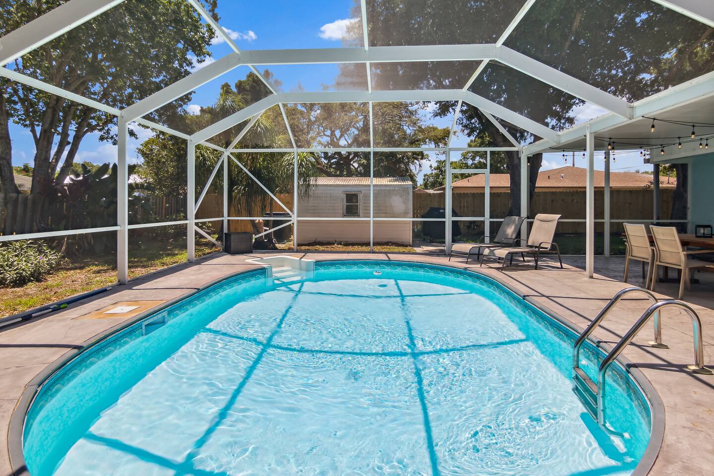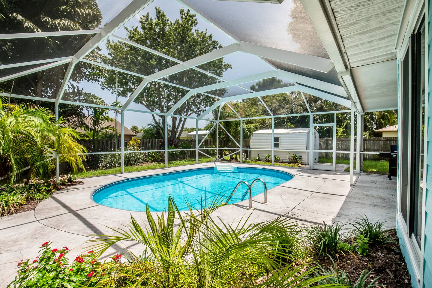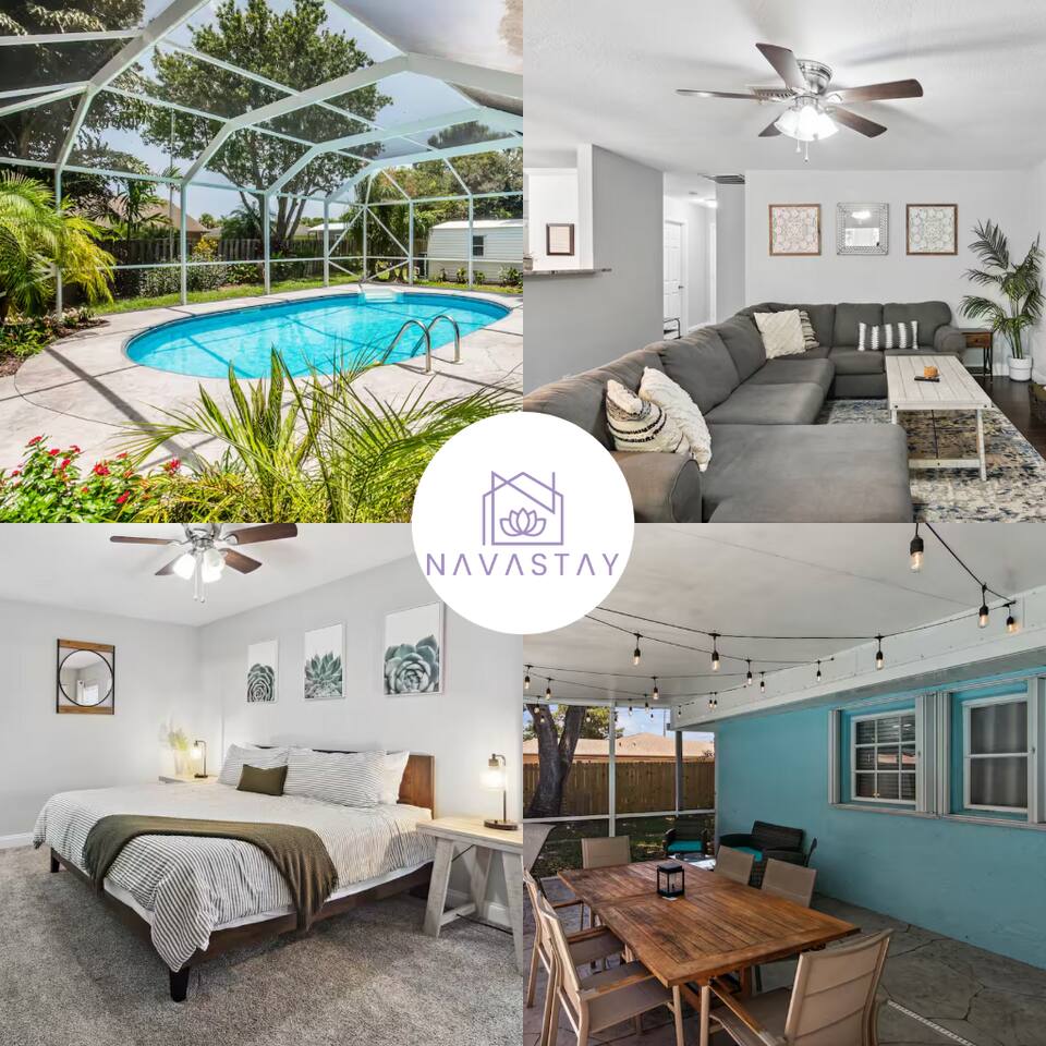 ***Serene Paradise~ just minutes from boat launch, Ocean, and River*** This home is positioned right next to the Indian River Lagoon! Very close to boat launches and water activities. Our home features a King Master Suite with private shower. There are two other bedrooms with a shared Bath, a large open Kitchen, pool view living room, a pool view family lounge, & a very nice dining area and coffee/tea bar. This private split floor plan is perfect for multi-family/couples arrangements!