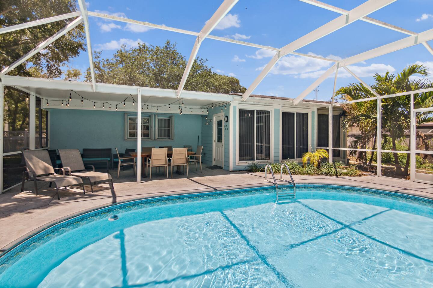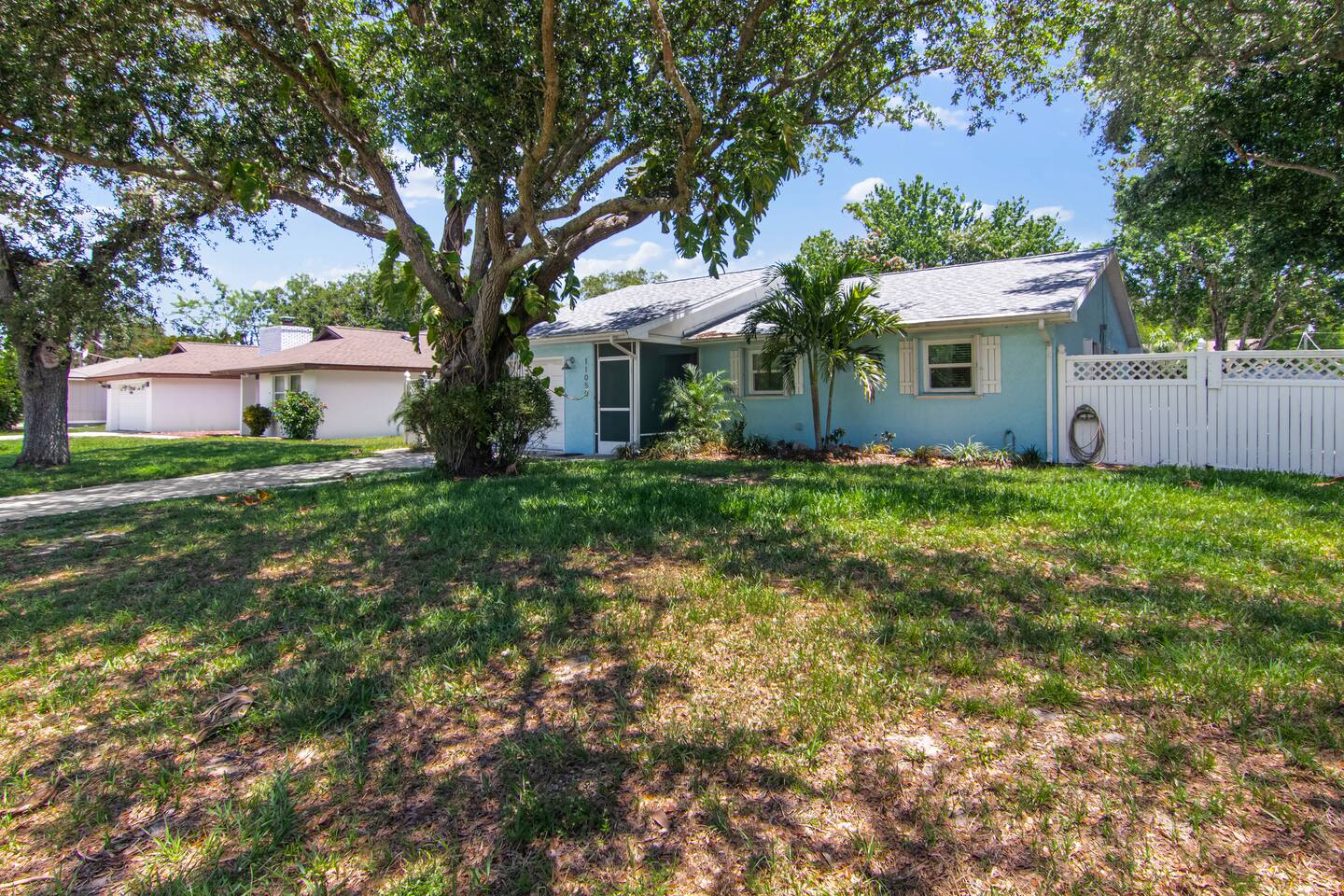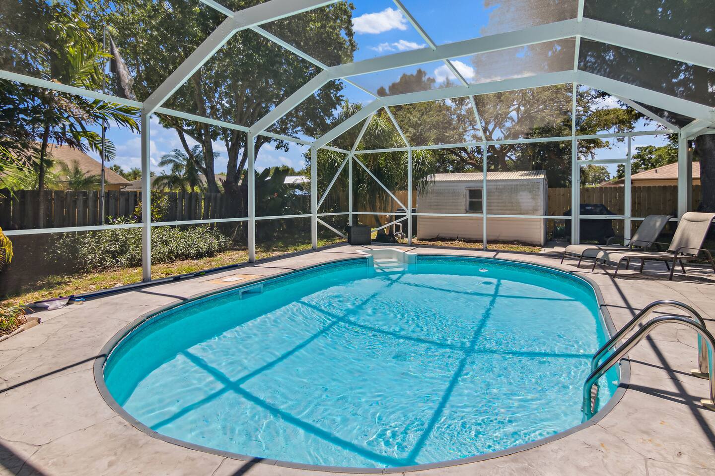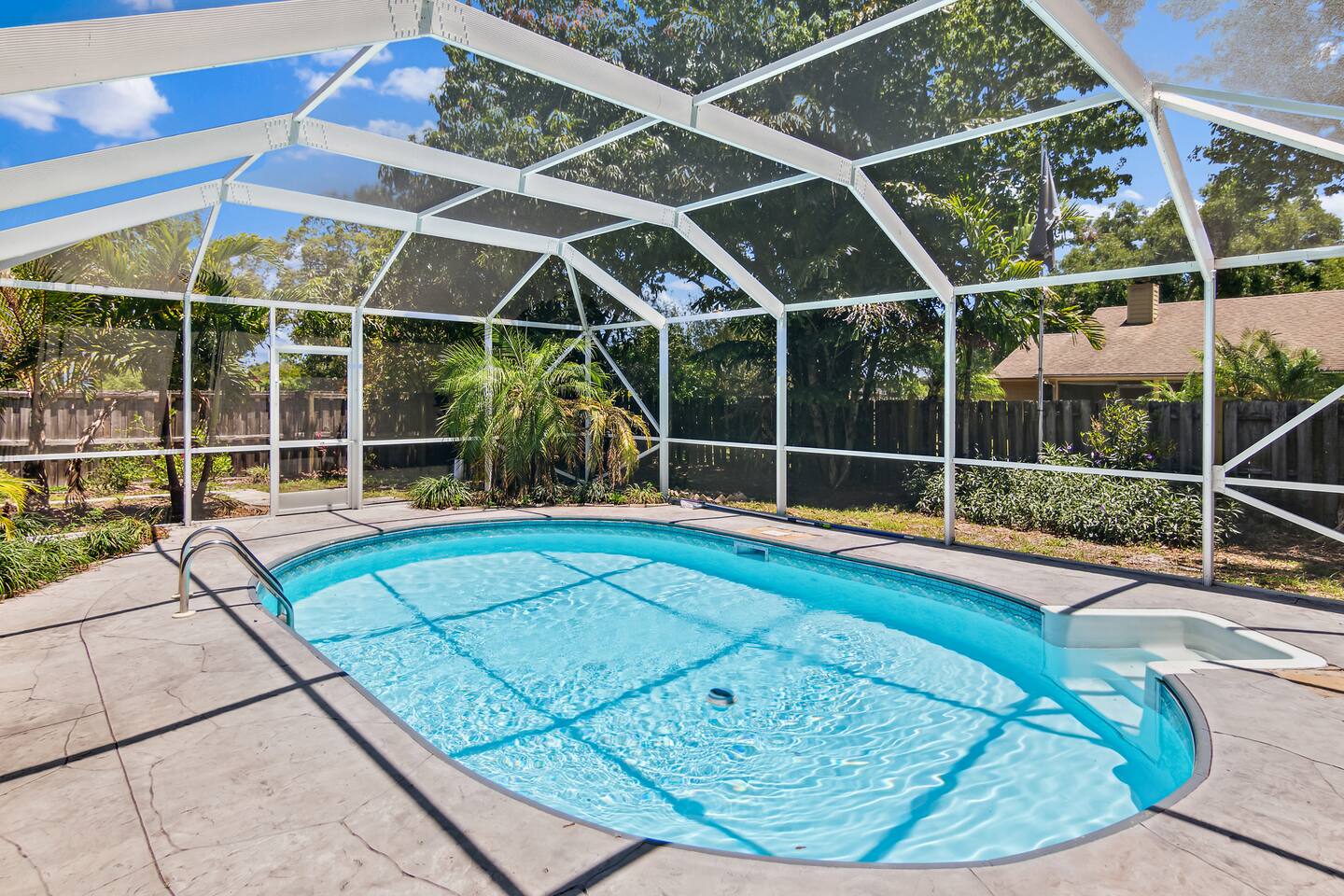***Serene Paradise~ just minutes from boat launch, Ocean, and River*** This home is positioned right next to the Indian River Lagoon! Very close to boat launches and water activities. Our home features a King Master Suite with private shower. There are two other bedrooms with a shared Bath, a large open Kitchen, pool view living room, a pool view family lounge, & a very nice dining area and coffee/tea bar. This private split floor plan is perfect for multi-family/couples arrangements!